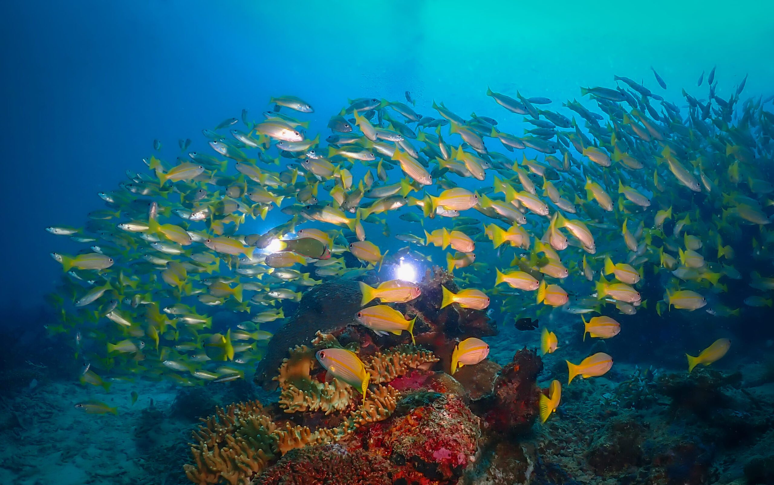Thousands of marine organisms – from tiny crustaceans, colorful snails, and countless coral fish, all the way to elegant manta rays and the king of tropical seas, the whale shark – share the same space here.